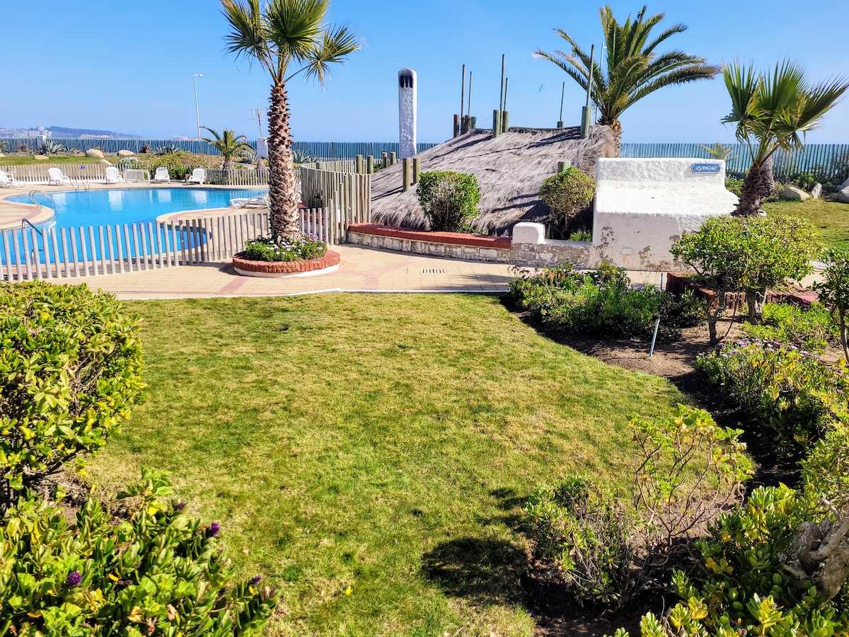 位于玫瑰湾的独家公寓。欧洲建筑,宽敞的公共区域和安全的海滩通道,位于Mirasol,Algarrobo。该公寓有三个大型游泳池和一个温水游泳池,小屋,沙滩,网球场和美丽的花园。享受舒适,宁静,与家人分享这个美丽的天堂,被大自然环绕,维护得很好。还有保安和管家。