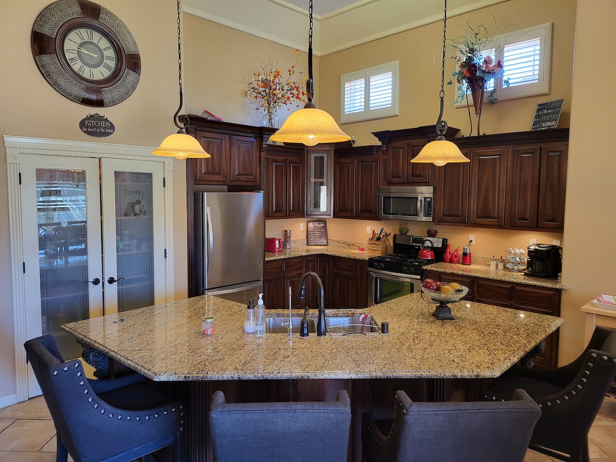 欢迎来到SunKissed度假屋!这座4卧室的绿洲位于埃尔帕索(El Paso)宁静的西侧,完美融合了舒适性和便利性。您可以在宽敞的主卧套房中放松身心,配备加大双人床和私人电视,也可以在其中一间标准双人床卧室中放松身心。有4台室内电视和1台室外电视。这个宠物友好型房源靠近购物中心、餐厅,可快速前往I-10,位于一个安全安静的街区,是您下一个放松度假的理想选择。适合团体或家庭入住!