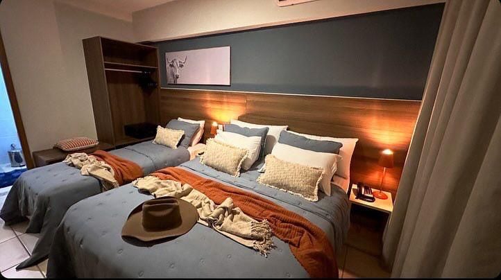 Ideal para 3 adultos e uma criança, para maior conforto, mas sao permitidos ate 4 adultos no máximo, por hospedagem. Tem duas camas de solteiro que juntas transformam-se em de casal e um sofá cama para até duas pessoas. Enxoval completo fornecido. Acomodação charmosa e sofisticada. Localizada dentro do Parque do Peão de Barretos. A maior festa de rodeio da América Latina Predio novo, com restaurante, academia, piscina aquecida, lago, área para caminhada, quadras de beach tênis e vôlei,
