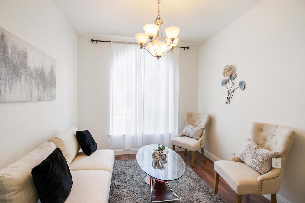 这间时尚的新装修单卧室公寓配备了您所需的一切,让您感觉像在家里一样。享受加大双人床、55英寸智能电视、舒适的角落(配备双人床)、洗衣机/烘干机、2级电动车充电器、花园(有鲜花、蔬菜和果树)。设备齐全的小厨房和用餐空间。靠近中城、市中心、Golden One、加州博览会、探索公园、商店、餐厅、高速公路和轻轨。附近有很多医院。提供婴儿用品。附近有徒步路线和河流通道。前往旧金山、太浩湖、纳帕等地的一日游。