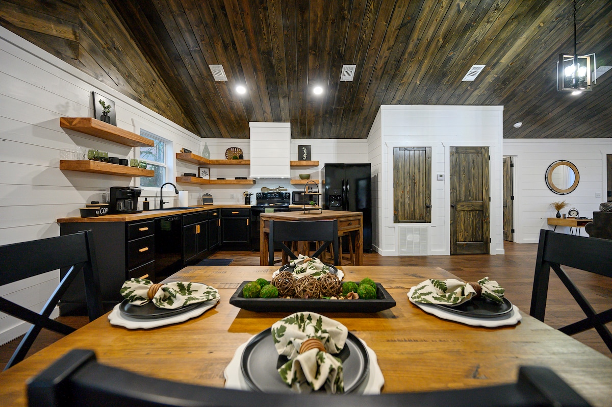 现代奢华小木屋 | 2间加大双人床套房 • 电动车充电桩 • 允许携带宠物 探索现代风格——位于布罗肯鲍(Broken Bow)3.5英亩私人土地上的令人惊叹的前卫设计小屋。 拥有18英尺高的天花板、大窗户、全白色厨房、木制炉灶和2间豪华特大套房(一间带浸泡浴缸)。 欣赏森林景观,在火堆旁取暖,并在现场为电动车充电。 也适合携带狗入住!马上预订您的难忘度假之旅。