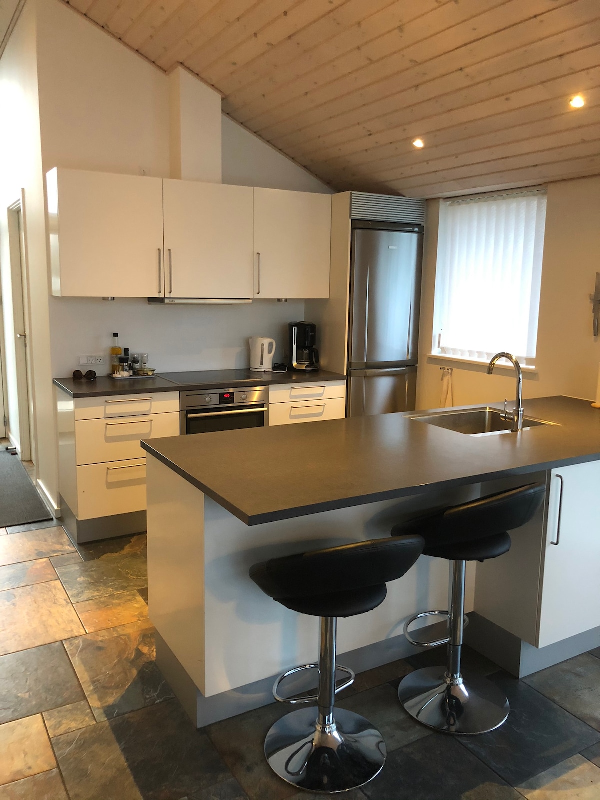 在这座独特而安静的房源中放松身心,俯瞰瓦伊勒峡湾、田野和森林。 房子设有带厨房的客厅、用餐区和沙发区、带淋浴的马桶,楼上有卧室。 有两张高架床(双人床)和一张单人床。 请记住,通往一楼的楼梯有点陡,双人床周围没有太多空间。 外面有两个露台,均可观赏美景。 有一个燃木炉灶,可免费使用木柴。 包括床上用品和毛巾。
