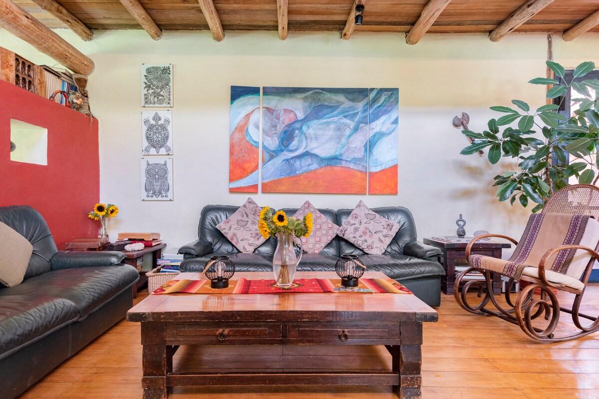 宽敞明亮的7x4米独立房间,可直接欣赏9x9米的郁郁葱葱的花园。 Tayta Wasi是一家位于皮萨克市中心的精神和艺术客房。 花园是一个共享的生活空间,音乐家、旅行者和朋友经常经过,增添了良好的能量和艺术氛围。 房间内有沙发、桌子、地毯和自然光。 共用厨房、干净的卫生间,我们的咖啡厅提供早餐,价格为15索尔。 休息、创作和享受积极氛围的好去处。