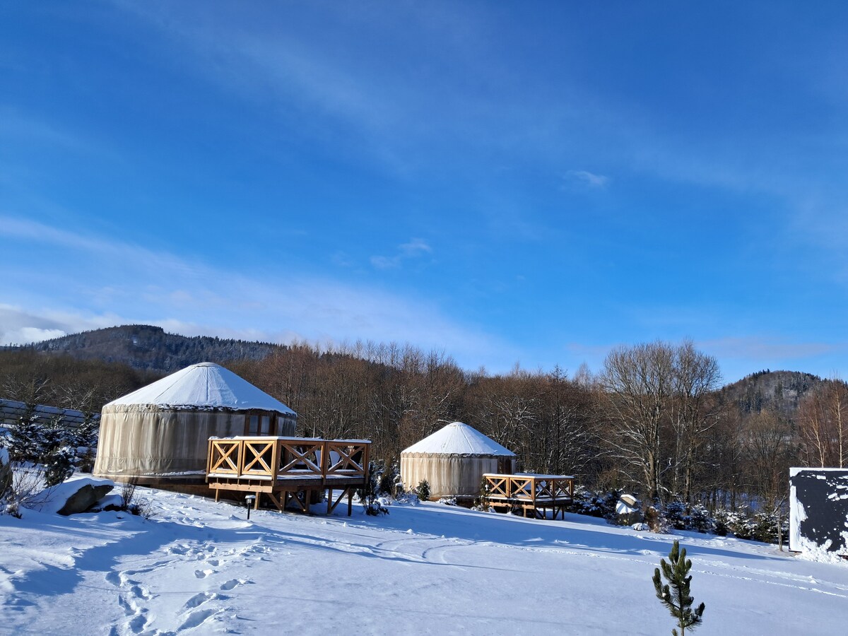 Izera Glamping Adults是一种奢华的体验。欧洲唯一的蒙古包!它们配备了暖气和空调,还有一个木制壁炉。 通过玻璃屋顶欣赏山脉和星星的景色,非常有趣。 蒙古包中的浴缸绝对是新奇的。 在2×1.5米的屏幕上观看最佳电影 - 家庭影院套装,带VOD! 私人水疗中心:在星空下享受桑拿和按摩浴缸!预约按摩。 真正的豪华露营。体验非凡的住宿。好好休息!参观未被发现的伊泽拉。