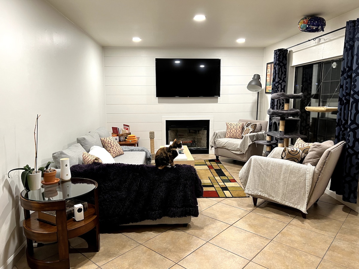 现代化的单间公寓,设有独立入口、专用停车场,可轻松前往海滩、公园、市中心等。 客房套房包括独立卫生间、高挑的天花板、木地板、空调和迷你分体式暖气。 小厨房区域包括水槽、微波炉、电炉灶和冰箱。 后门通往带仙人掌花园的门廊,您可以在那里休息、烧烤或欣赏美丽的山坡日落。 适合远程工作,非常适合情侣或独行旅行者入住。 今天就来看看这个宝藏吧! 🌵