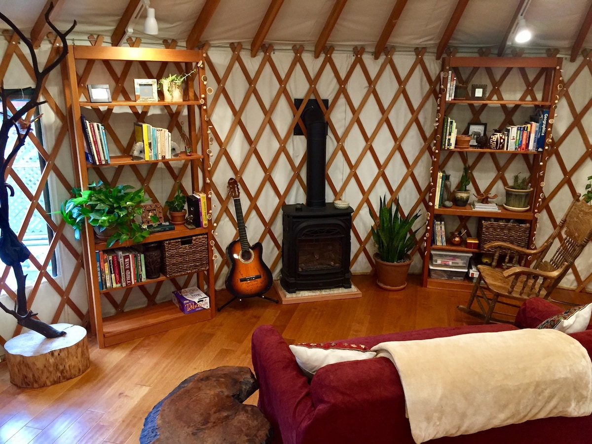 宁静、干净、宽敞、装饰精美、安静的24英尺圆顶帐篷,位于圣克鲁斯山顶,完全被红杉环绕。花几天时间冥想、阅读或撰写回忆录的下一章。步行即可抵达马东纳山(Mount Madonna)休闲中心(目前仅限预订)。距离县立公园徒步和骑马小径不到3英里。摄影和山地/公路自行车的理想场所。