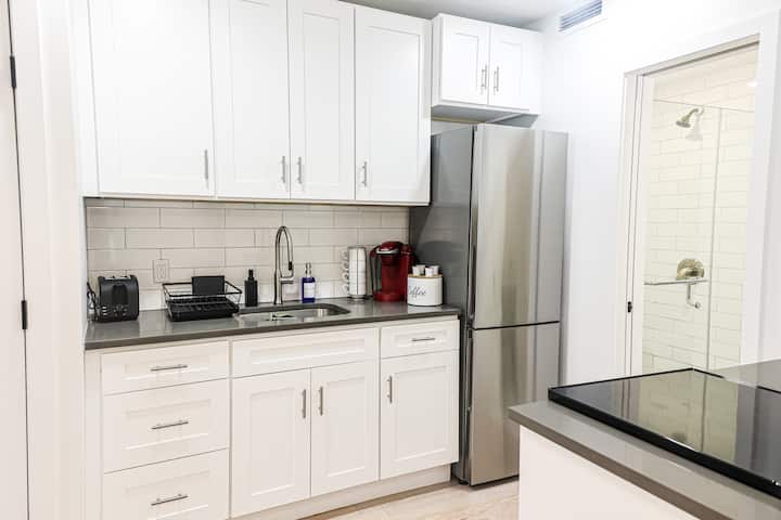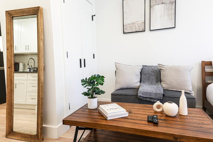 装饰有原始硬木地板、标准双人床、充足的自然光线、最先进的电器/橱柜(不锈钢冰箱、微波炉、烤箱和电炉灶)、面向西方的景观、大理石瓷砖、时尚的玻璃淋浴隔断和全新的家具(沙发、书桌、咖啡桌、咖啡机、银器、碗/盘、清洁产品);这些简洁的装饰完善了这间非常现代和时尚的单间公寓。室内设计采用开放式布局,将客厅、餐厅和睡眠区无缝融合。在一天的城市探索后,配备高品质床上用品的标准双人床可确保您的夜晚安睡。其他亮点包括全新家具、遮光百叶窗以及100%亚麻遮光窗帘、超柔软的床上用品、豪华土耳其毛巾、高速无线网络和各种流媒体服务/产品(Netflix、Apple、HBO、Prime、Peacock、Disney+、Hulu、YouTubeTV、fuboTV等)。