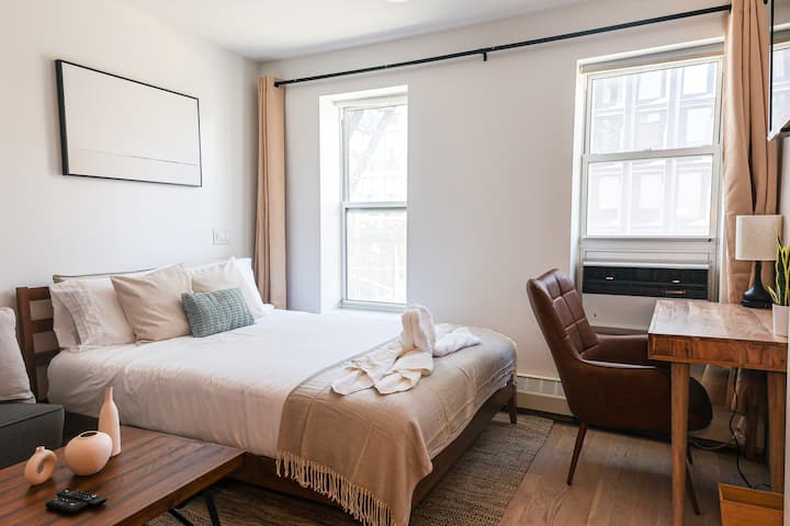 这间明亮的单间公寓经过全新翻修,从漂亮的硬木地板到不锈钢家电/大理石瓷砖浴室,采用现代时尚的装修。 这座时尚、现代的城市天堂旨在为您在纽约市的住宿提供时尚和舒适的体验。