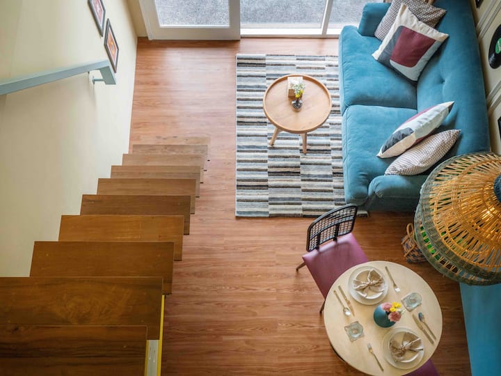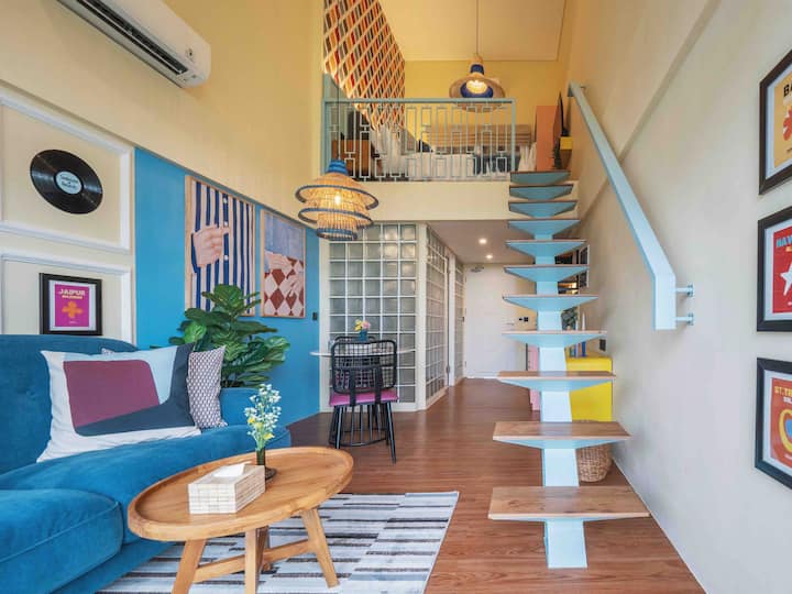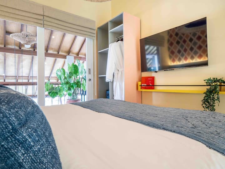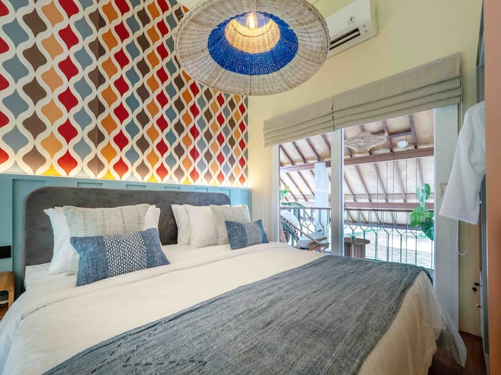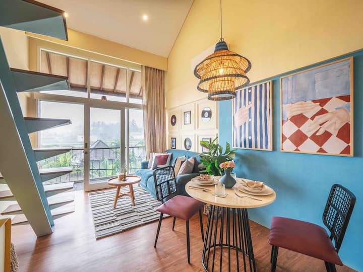 这间单间公寓位于二楼,配有阳台和躺椅,面向绿色稻田。 私人单间公寓本身设计为阁楼,高天花板,底楼和上楼通过楼梯相连。 所有六间客房均设计独特,这间客房灵感源自经典多彩的复古室内装潢。 单间公寓配有套浴室和楼下厨房。 您的房间外面有一个公共区域,包括躺椅和工作/餐桌空间。 您可以在楼下找到带日光浴床的共用泳池,您可以在那里放松身心。