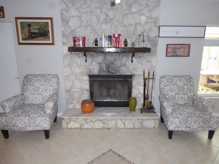 在泳池酒吧和室外大型公园式木炭烧烤架旁享受我们的室内和露台! 客厅里到处都有一个新的82英寸三星和其他电视。 我们运行高速光纤互联网!