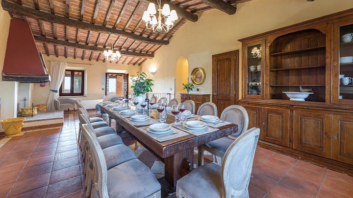 斯特龙科利别墅(Villa Stroncoli)是一座大型托斯卡纳别墅,坐落在锡耶纳和阿雷佐之间的曼萨尔托庄园,四周环绕着连绵起伏的山丘和葡萄园。