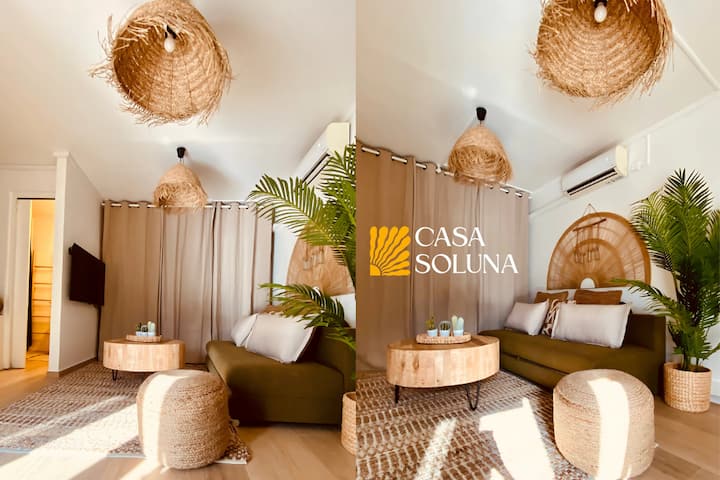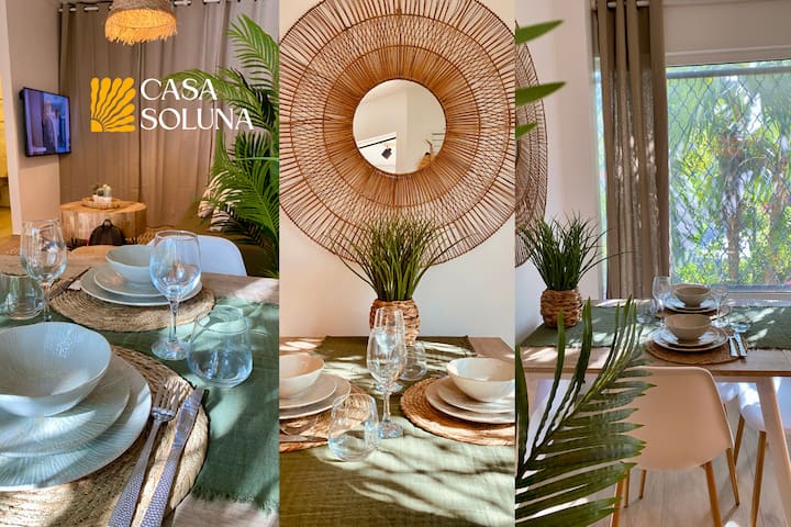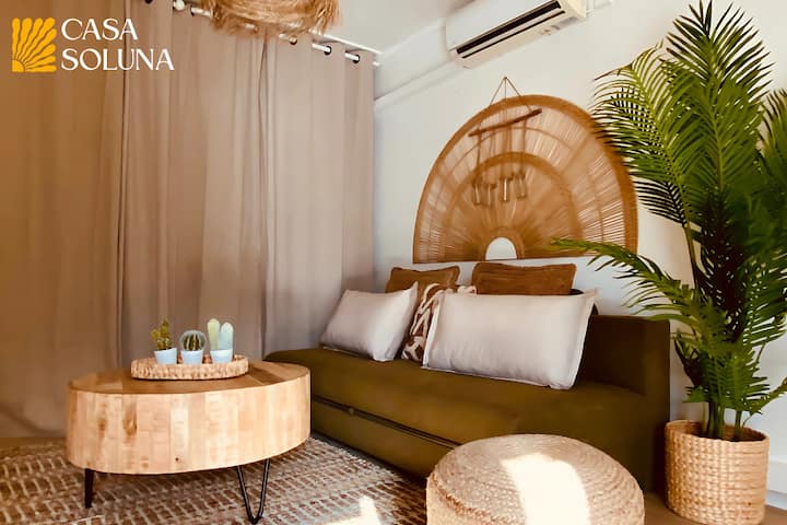 在鳍片下醒来,步行300米,沉浸在碧绿的水中:Casa Soluna是一套经过全面翻修的T1公寓,被认为是融合巴厘岛和图卢姆影响的波西米亚时尚避难所。