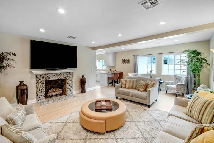 这个令人惊叹的房源非常适合家庭和有趣的团体旅行。这套装修精美的房源距离环球影城不到8英里,靠近文图拉大道(Ventura Blvd),位于谢尔曼奥克斯(Sherman Oaks)中心一条安静的街道上。设有5间卧室和4间卫生间,最多可入住10位房客。 后院有大型加热盐水泳池,配备热水浴缸、火坑和烧烤区。设施齐全的美食厨房、宽敞的客厅(配备85英寸电视和壁炉)和经典游戏鸡尾酒游乐场。