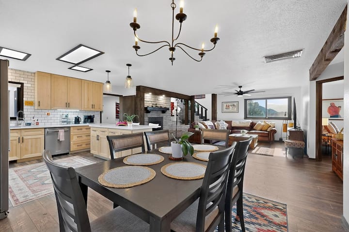 开放式厨师厨房配备了您需要的一切-并排冰箱/冰柜、双烤箱炉灶、搅拌机、烤面包机、电饭煲/慢炖锅、微波炉、Keurig咖啡壶、烧水壶以及炊具、餐具和餐具,可满足休闲用餐需求。 厨房设有大型准备酒吧,您可以在那里烹饪,而其他人则坐在酒吧凳上,陪伴您或提供建议;)