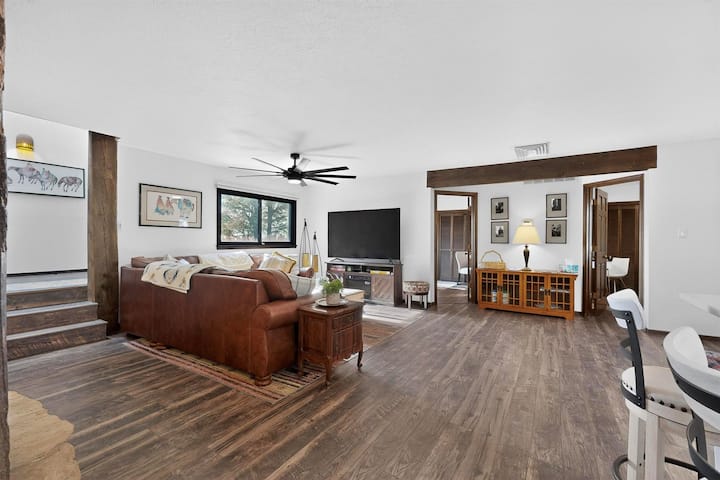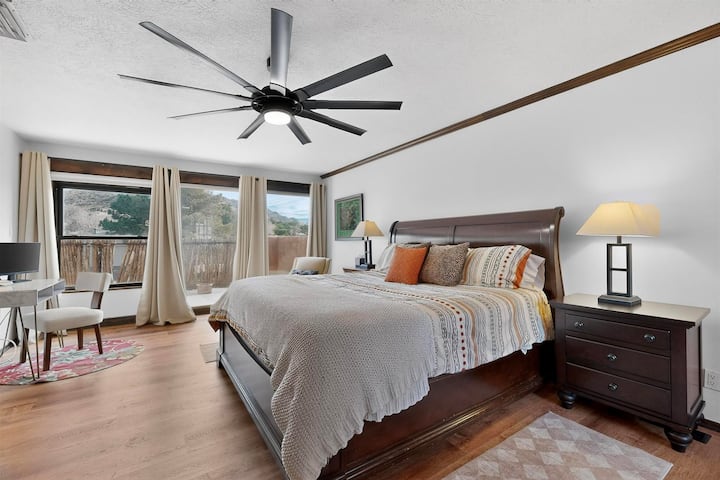 在我们的家中享受阿尔伯克基的最佳体验。 华丽、僻静的林地和壮丽的露台景观。 宽敞的主套房,配备加大双人床、带浴缸和步入式淋浴间的水疗浴室,可欣赏日出山景和日落城市景观。