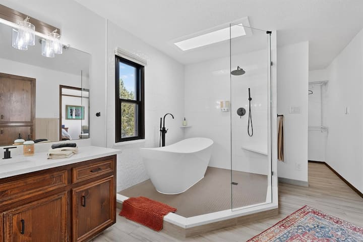 从前门爬上半段楼梯,您进入主卧套房,配有一张加大双人床、一堵玻璃墙、面向山脚和日出阳光的窗户,以及可欣赏城市景观的大型日落甲板。 主套房提供隐私,远离一楼的起居空间,设有阅读椅和躺椅,等待您蜷缩咖啡和书籍。 享受新装修的大型水疗浴室-配备两个水槽、宽敞的台面、一个带马桶的独立洗衣柜,以及一个带现代化浸泡式浴缸的独立浴缸和带淋浴头的步入式淋浴间。 一个大型步入式衣柜完善了浴室区域。