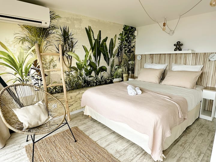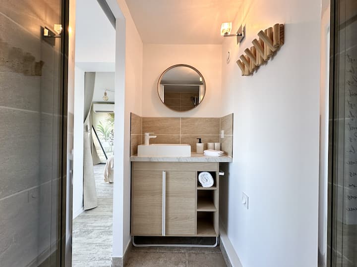 这套23平方米的两室公寓于2024年全面翻新,带有约17平方米的私人露台,由一间卧室、一间配备柜台和基本设备的开放式厨房、一间带淋浴间和洗脸池的卫生间和一个独立的厕所组成。 没有室内客厅或电视。 您可以在厨房柜台或露台桌上享用早餐和晚餐。