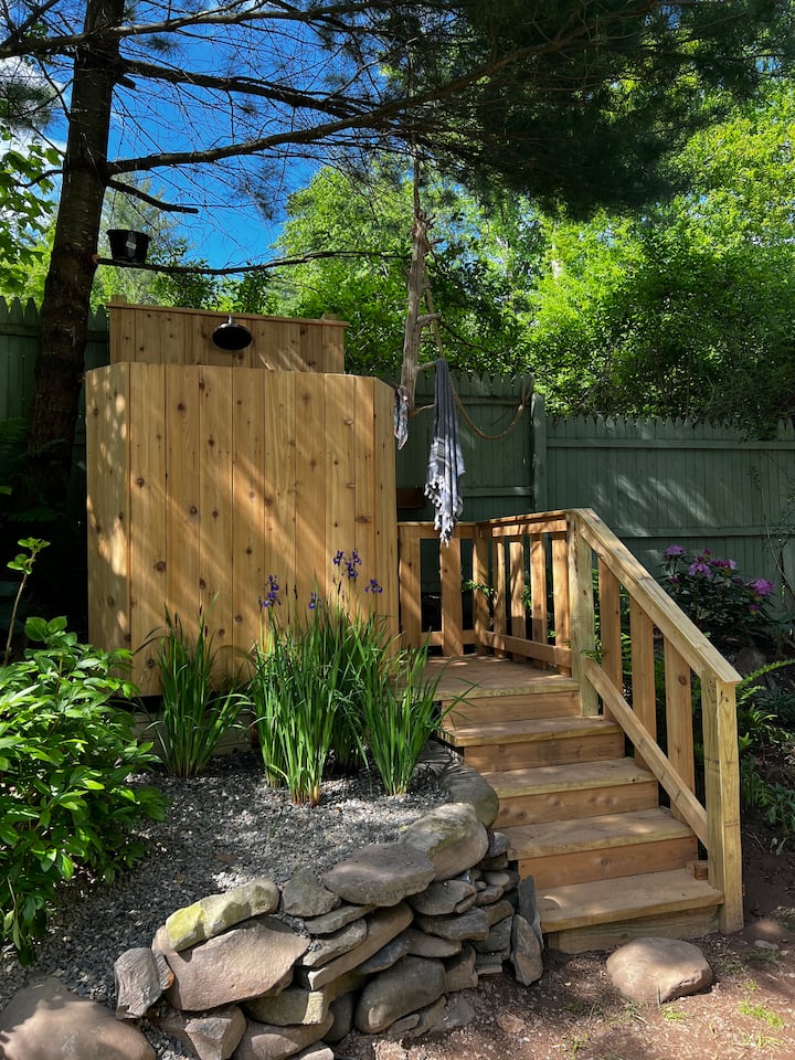 * 雪松热水户外淋浴间,坐落在花园一侧