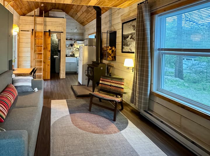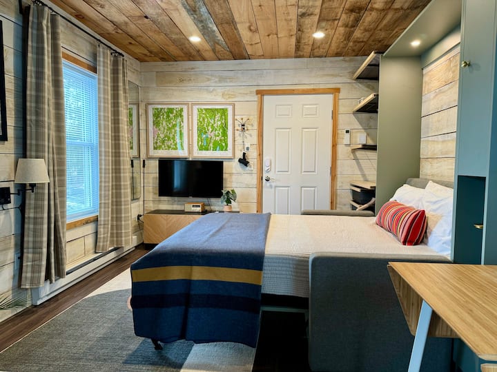 寒冷的夜晚,提供舒适的燃木炉,夏季提供中央空调,让您感到舒适。厨房设备齐全,效率高。房源配备了可收看流媒体的电视、快速无线网络和一张Murphy Wall床!