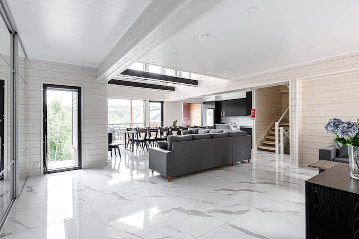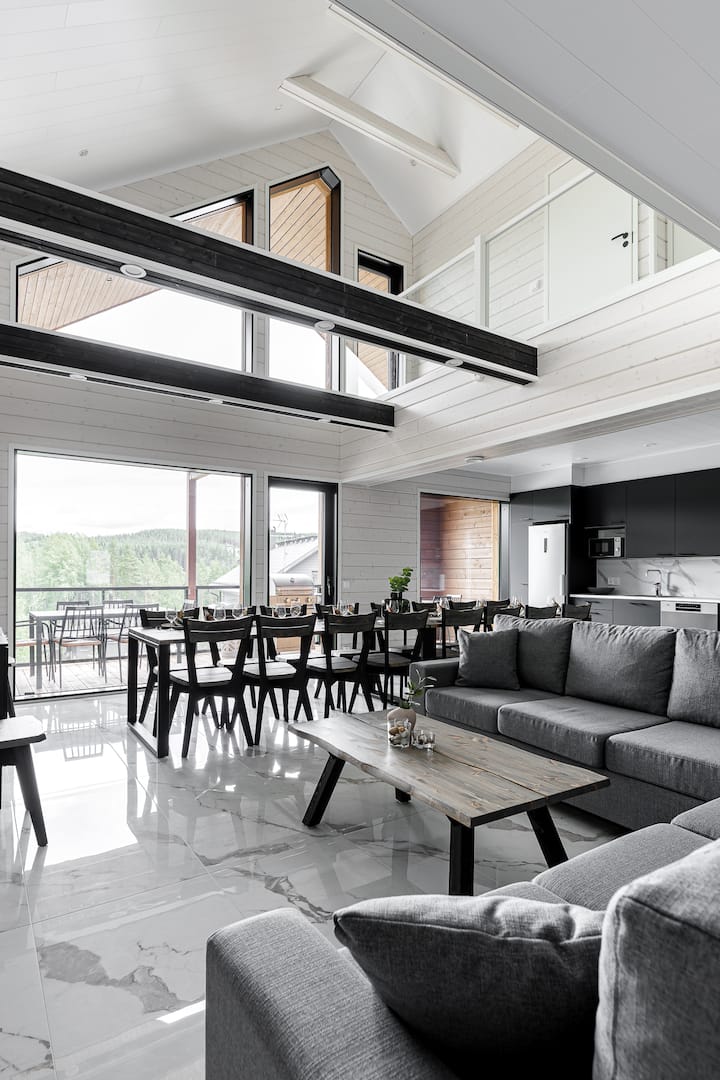 Villa Luxus Helmi 1-3别墅建在Himos的中心地段,位于高尔夫度假村地区,距离Himos Areena和中心仅约500米。 别墅配备了优质材料、家具和餐具,此外,每栋别墅还配有户外热水浴缸。 别墅的入口楼层设有可容纳16人的大型餐桌,以及休闲沙发,即使更大的团体也可以同时使用。 房间高度高,朝向Himos高尔夫球场的大窗户为房间带来空间和光线。