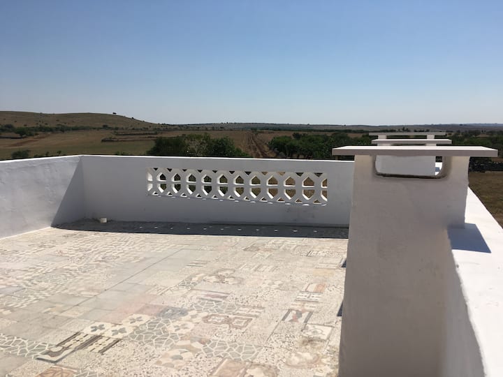 带全景露台和大房子的农庄,那里有驴子的田野和他们的小屋。 周围有橄榄树林、杏仁、小麦和饲料田,当然还有伪草原。