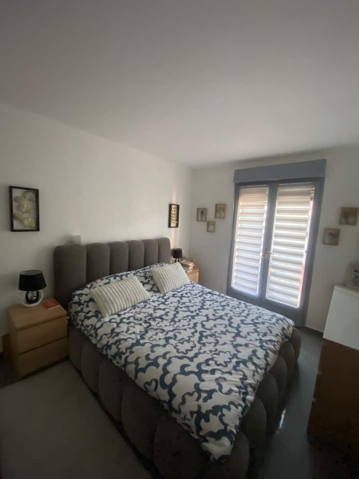 楼下的卧室部分有一间卧室,配有一张非常舒适的双人床160/200 ,一个梳妆台,可存放您的物品,可通往露台。