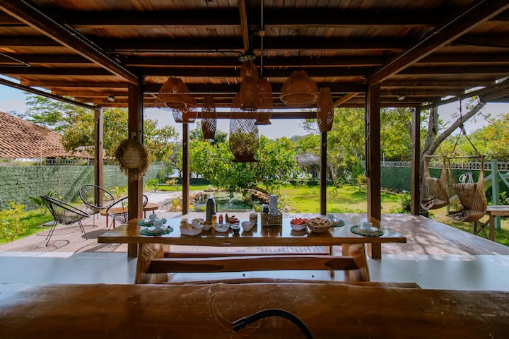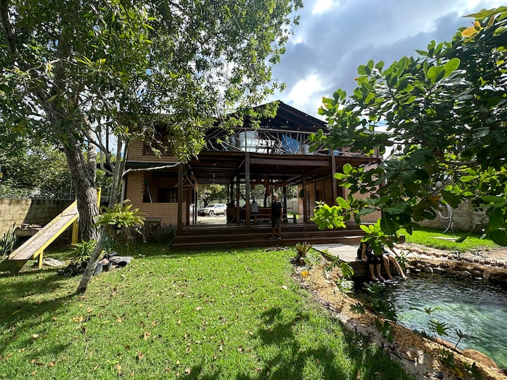房子有质朴的概念,木质,明显的砖块和生态屋顶,有湖景,邀请房客感受到这个宁静环境不可分割的一部分。 这里是家庭团聚的理想场所。 从后门可通往雅孔达湖( Lake Jacundá ) ,前门可通往Jacundá海滩2号( Jacundá beach 2 )。