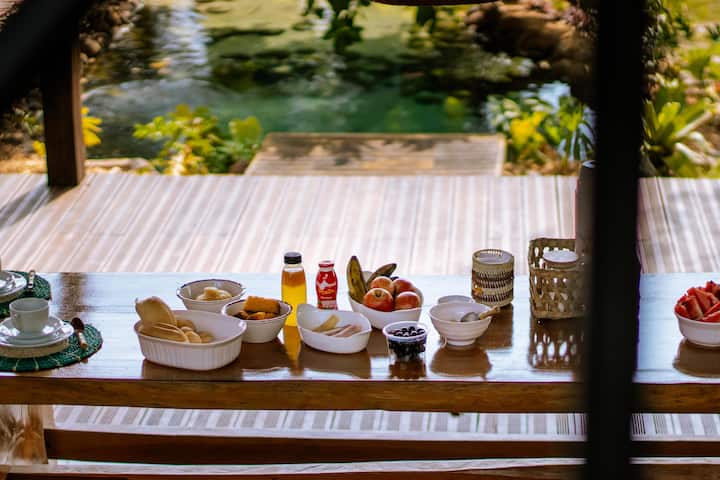 房间温馨舒适,每位房客都可以在清晨醒来时享受隐私和舒适,同时在门口清晨的宁静中醒来。 在鸟儿的鸣叫声和水中轻柔的低语中醒来时,这是一个唤醒的邀请。 房间内没有电视,楼上只有投影仪,可以与全家人整合。 除了便携式空调和风扇外,房间内还提供坐垫和加厚垫。 这栋房子也提供无线网络。