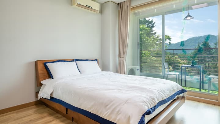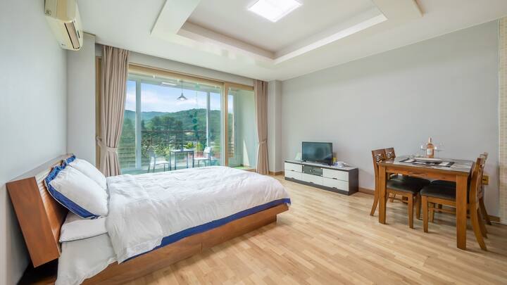 这是加平莲花湖( Gapyeong Lotus Lake )狗狗友好型膳宿公寓( Gapyeong Lotus Lake ) ,可通往窗外的湖景。 与您的狗狗一起在私人空间中打造难忘体验。