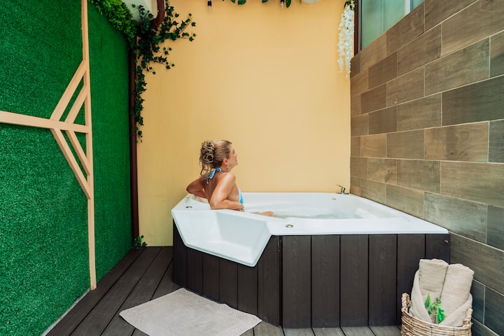 在热水浴缸中放松身心
