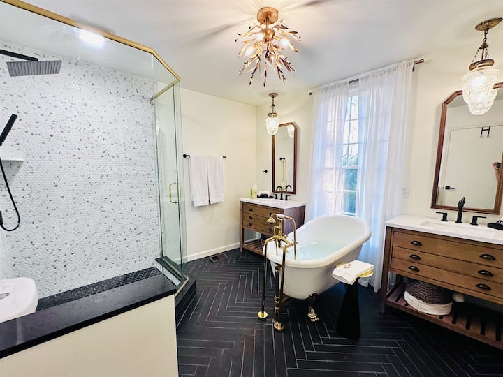 ✴ 主卧:楼下,1张加标准双人床,配备Standard Textile的豪华床上用品、套房卫生间和套房办公室、55英寸智能电视、全身镜、带无线充电垫的灯和专用电源端口。您一定会喜欢带爪脚浴缸、双盥洗台和步入式淋浴间的私人主浴室。