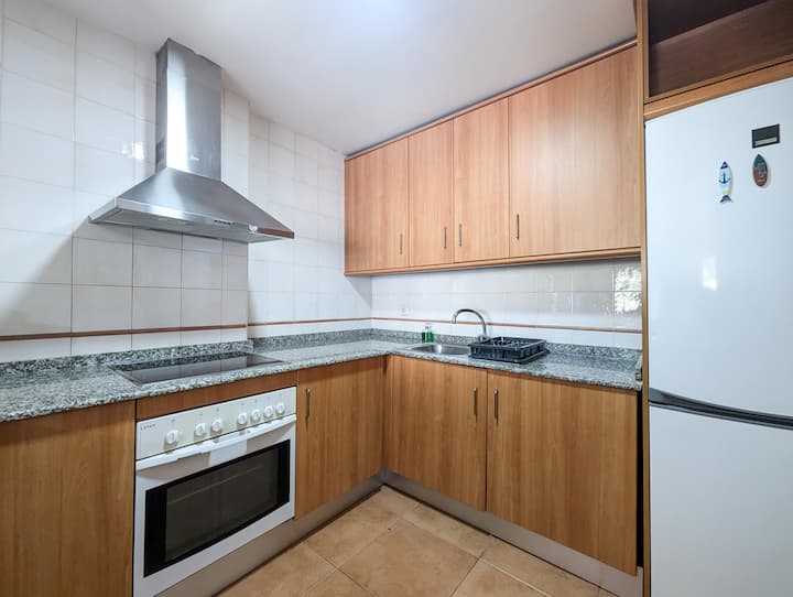 设备齐全的小厨房,配备美国酒吧,配备冰箱、电烤箱、水壶、微波炉、燃气水壶、烤面包机、咖啡机以及所有厨具和陶具。