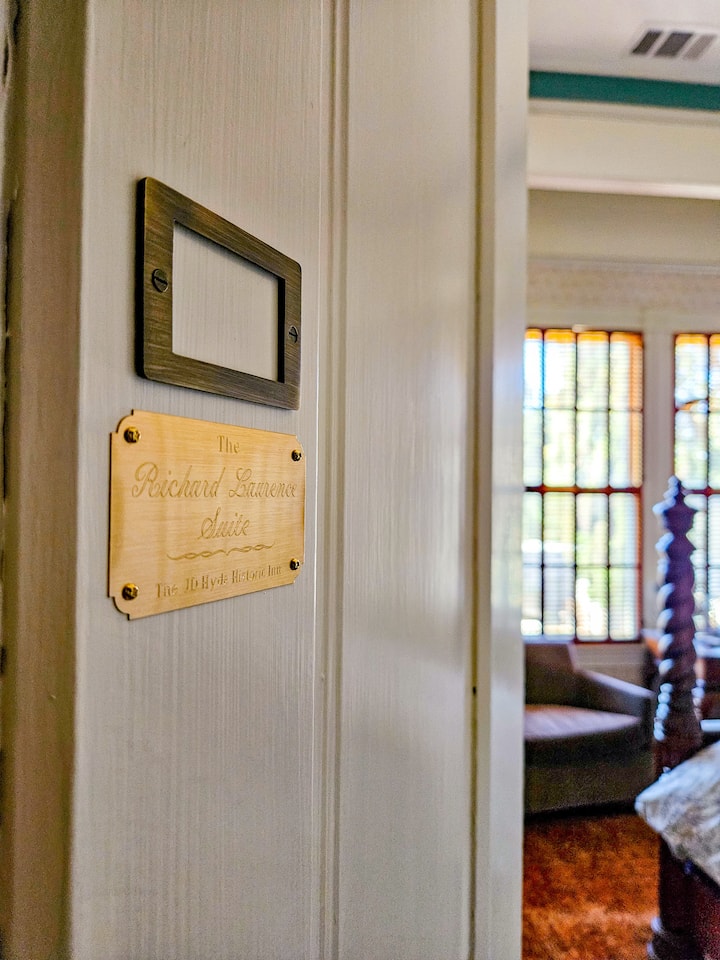对于此房源,您可以使用理查德·劳伦斯套房(楼上)和房屋底楼的公共区域,以及场地和现场停车位。 您无权进入我们旅馆老板居住的房源后面的客栈。 房子周围有密码门锁,我们的客栈老板会在您抵达时与您共用-公共场所无需钥匙。 您的套房有自己的钥匙,只有您才能使用。