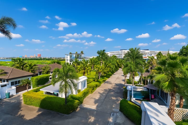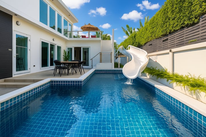 位于芭堤雅棕榈绿洲别墅、宗甸海滩的豪华三间卧室泳池别墅。 室内有滑水道、卡拉OK音箱。 设备齐全的厨房、小厨房、按摩浴缸、私人泳池、泳池桌、3间带套房浴室的卧室。3张加大双人床和2张标准双人沙发床。 保险箱、厨房用具、冰箱、炉灶、烤箱、电饭煲、水壶。 为您提供舒适住宿所需的一切。 不包括每日客房清洁服务,需额外付费。