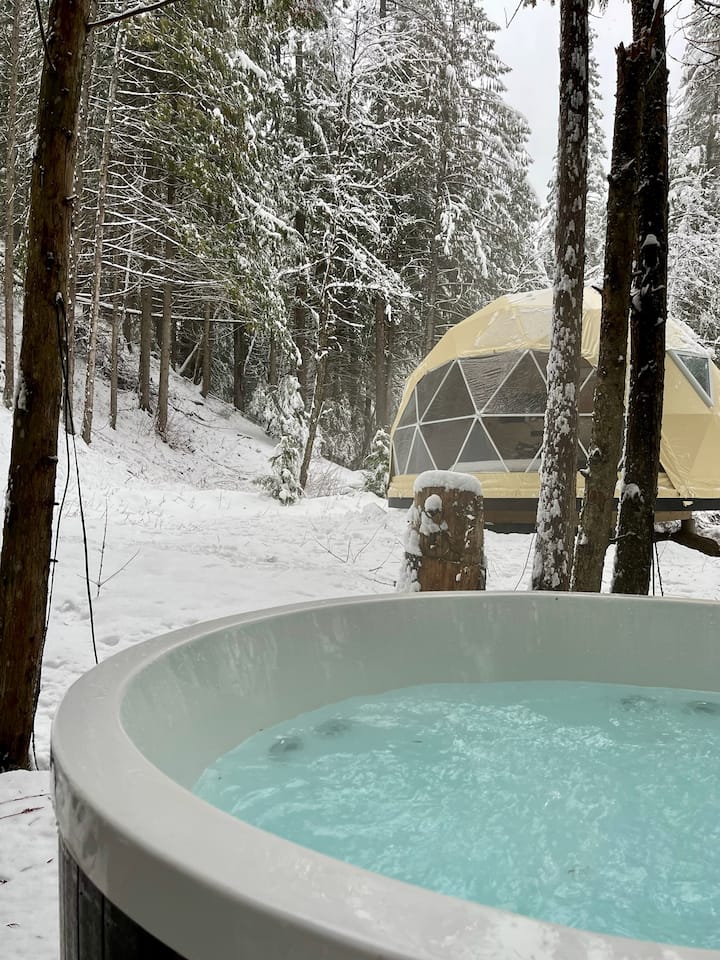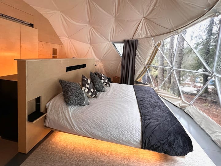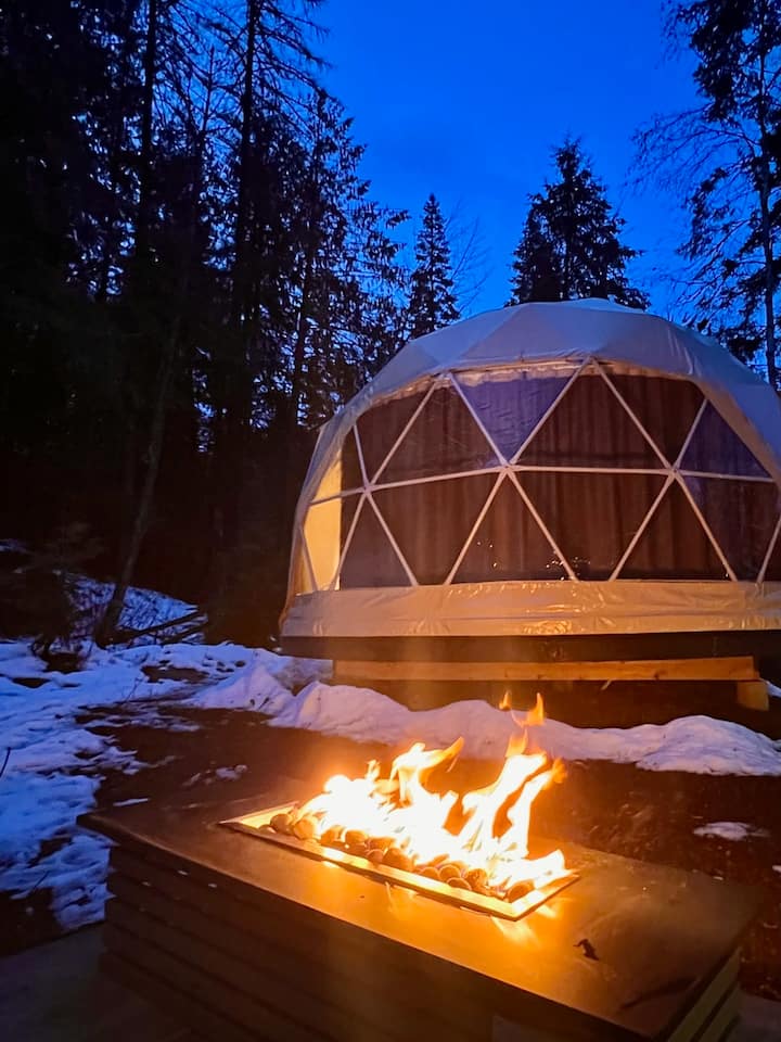 在我们温暖舒适的地热圆顶屋中逃离喧嚣,非常适合安静度假。 圣诞树将于12月10日摆放!房源配有舒适的2米宽双人床,大窗户让您与户外保持联系。 室内有柜台座位、小厨房和卫生间。 距离消防桌和私人热水淋浴间仅几步之遥。