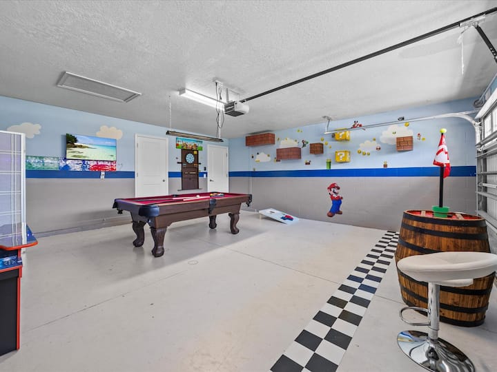 享受数小时的乐趣,享受超级马里奥兄弟主题的游戏室,配备台球桌、两款街机游戏、玉米洞、飞镖板和带酒吧座椅的电视,适合所有年龄段的客人!