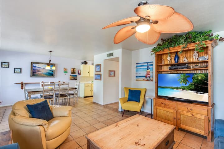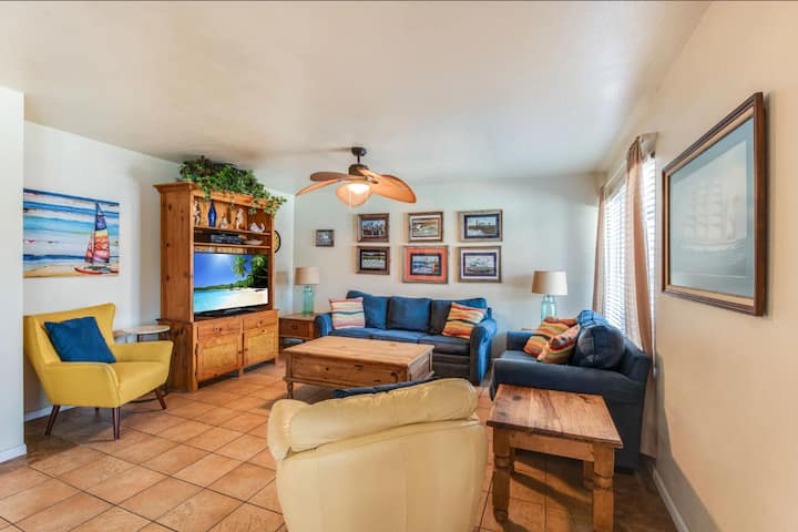 走出房门,即可享受共用的加热泳池,在海滩上玩耍一天后,您可以在这里畅游,唤醒身心。 房源还提供高尔夫球车接送服务,方便您探索附近的景点。 在阳光下度过愉快的一天后,您可以使用户外淋浴间冲洗身体,共用烤架非常适合晚间烧烤。