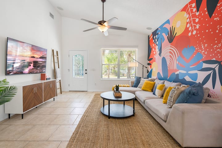 便利设施:热带后院,后院设有围栏,以保障宠物安全。 恒温泳池。包括一些沙滩装备-沙滩毛巾、4把椅子和一把雨伞。 洗衣机。儿童大小的豆袋。3个躺椅。 丙烷烧烤。当地采购的艺术家壁画。 室外淋浴间、丙烷烧烤架和小木柴火坑。 客厅有线电视,其他电视有带Netflix、Hulu等的Roku。
