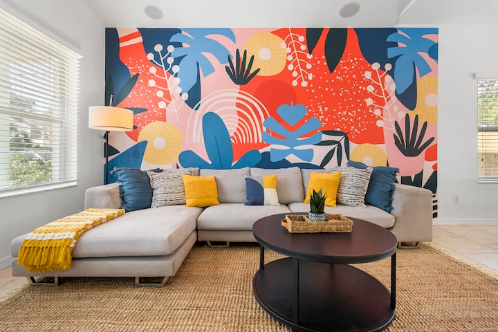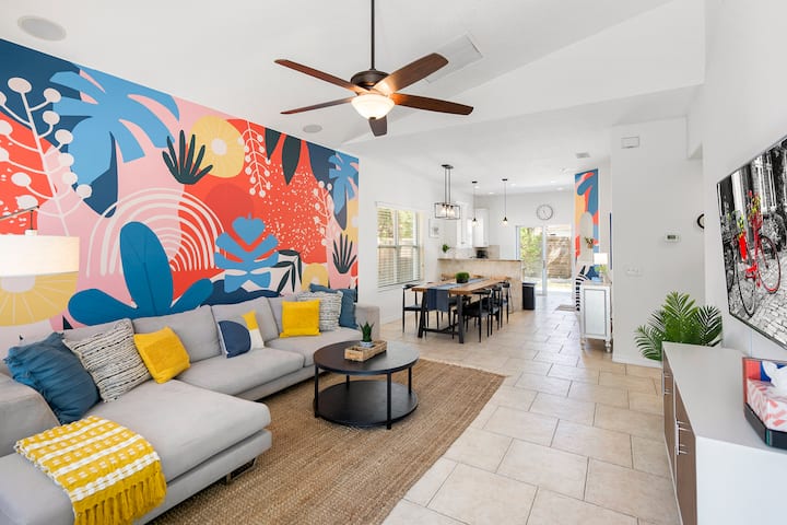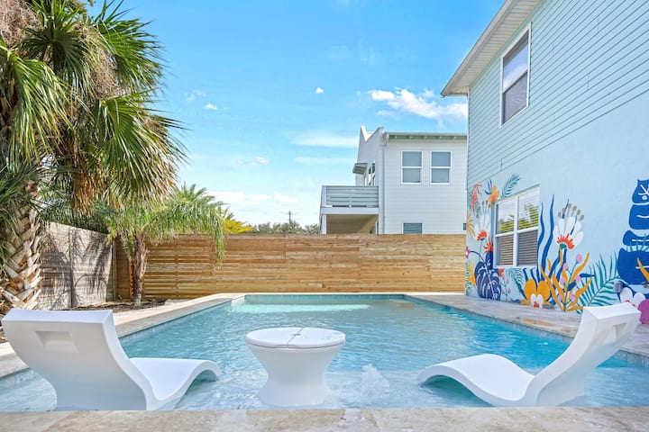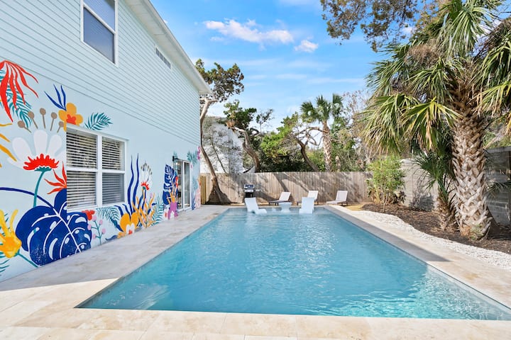 The Skinny:这套3卧房源距离沙滩仅1.5个街区,距离海滩木板步道仅几步之遥,您可以在几分钟内到达沙滩和水域! 后院有令人惊叹的早晨阳光,您可以在那里仰泳,而孩子们在华丽的大型游泳池中漂浮。 您可以在阴凉处享用咖啡或在阳光下喝一杯! 3张躺椅非常适合晒太阳,我们的丙烷烧烤架就在厨房后门旁边,我们有一个儿童尺寸的豆袋,供后院乐趣! 车库里有沙滩装备,让您与整个团体一起享受有趣的海滩之旅! 当地艺术家Kelly King在房源后方绘制了独一无二的社交壁画,供所有人欣赏!