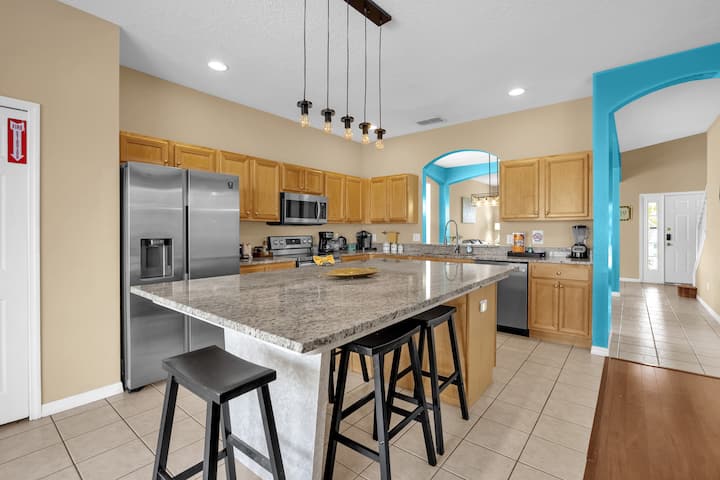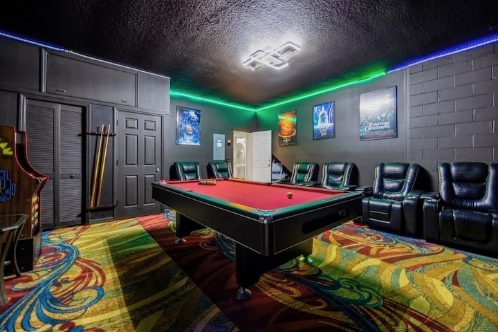 Emerald Island度假村宽敞的7卧室房源,距离迪士尼仅15分钟车程,非常适合大家庭或团体入住。 享受私人屏风泳池和水疗中心、主题儿童房、多间特大套房以及带台球桌和街机游戏的游戏室。 房源内还设有婴儿床和最多可停放6辆车的停车位。 这里有度假村设施和充裕的空间,让您放松身心,是奥兰多团体度假的理想之选。