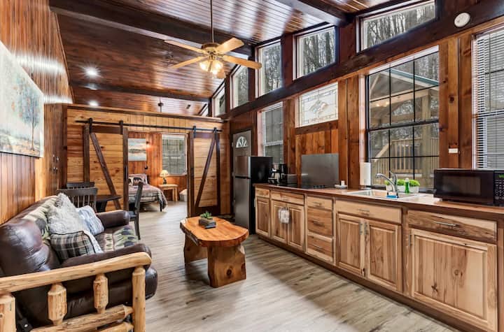 带砖炉和池塘的小木屋