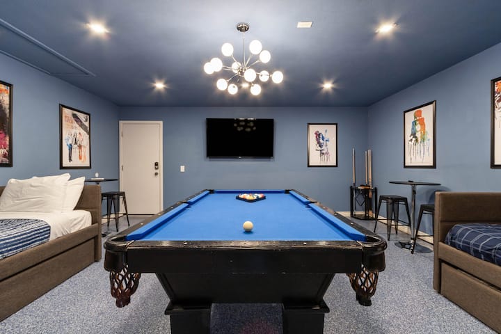 游戏室:这个空间为终极聚会体验奠定基础,为您和同行者提供各种娱乐选择。 享受友好的台球游戏,或聚在智能电视旁观看您最喜爱的体育节目。 游戏室还兼作额外的睡眠空间,配有两张单人沙发床,每张单人沙发床均配有双人脚轮,为额外房客提供舒适的住宿体验。