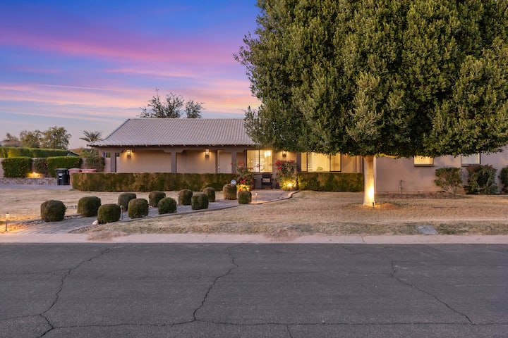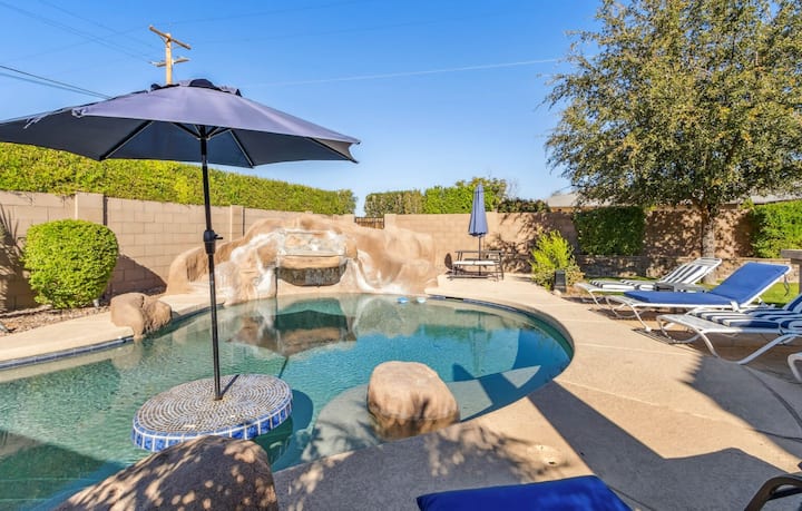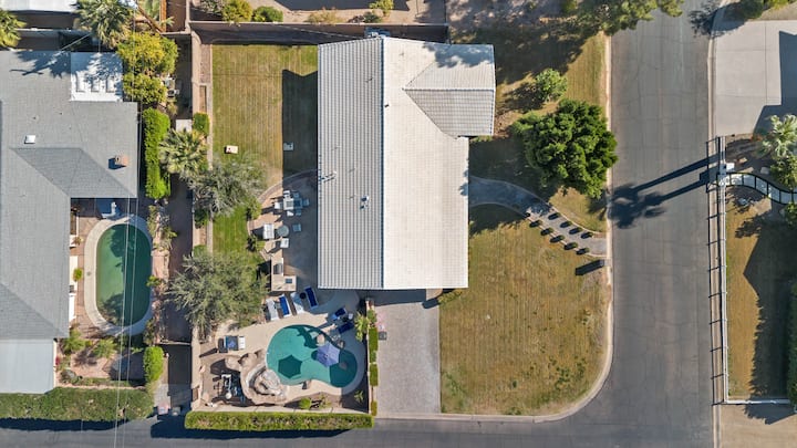 蓝宝石的后院是一个私人的斯科茨代尔度假胜地,专为放松而建。 您可以在室外用餐,享用内置烤架烹制的美食,在沙漠阳光下的泳池边休息,或在波光粼粼的泳池中放松身心。泳池配备超大台阶和水中桌子,是您享用饮品的完美场所。 脱下鞋子,在郁郁葱葱的真草坪上与大自然亲密接触,非常适合放松身心。 这里有很多舒适的躺椅,可欣赏壮丽的日落景观,是感受亚利桑那州氛围的理想场所。