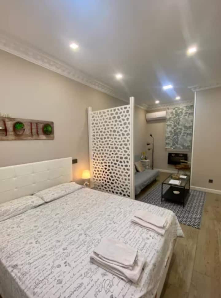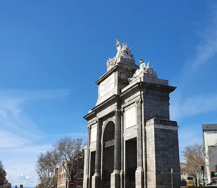 这间舒适的单间公寓靠近Puente de Toledo ,提供开放式空间,配有一张双人床和一张沙发床,由屏幕隔开,以保护隐私。 设有设备齐全的厨房(微波炉、冰箱、陶瓷炉灶等)和一个小露台。 浴室配有步入式淋浴间和窗户,可自然通风。 可应要求提供空调、洗漱用品和额外服务,如婴儿床和高脚椅。 非常适合位于马德里市中心的短期或长期住宿。