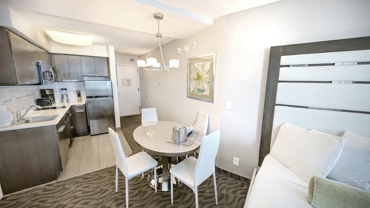 每天早晨醒来,从舒适的大床上可欣赏一英里长的美景。 与您的特别的人坐在整个窗户座椅上喝一杯睡帽,晚上看着木板路上的灯光,摩天轮和赌场灯闪耀着光芒。 所有这些都来自您的私人公寓!