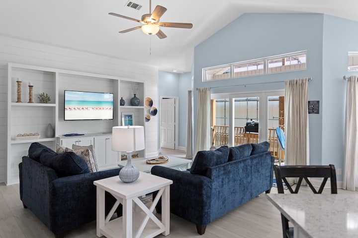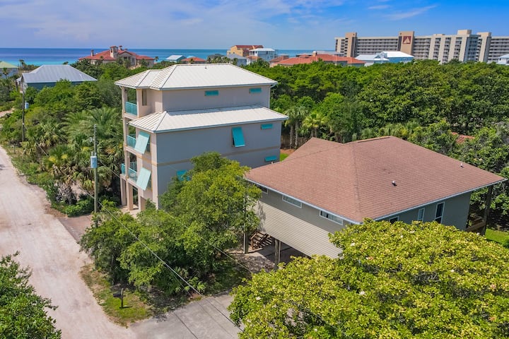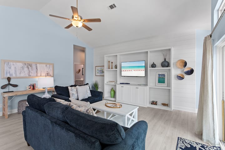 从Hideout出发,步行或乘坐高尔夫球车(住宿期间可免费使用)即可抵达米拉马尔海滩(Miramar Beach)的糖白色沙滩和翡翠色海水。 您将靠近风景优美的海滨餐厅,如Pompano Joe 's,以及Silver Sands Premium Outlets和Destin Commons的购物中心。 Tang-O-Mar社区感觉像一个宁静的海滨隐蔽处,但距离一切都只有几分钟路程--锦标赛高尔夫、水上运动、海滩酒吧和家庭友好景点。