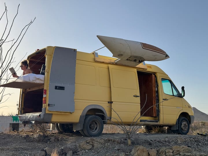 准备好在我们的太空飞机上升空,享受舒适与冒险的完美结合。 配备标准双人记忆泡沫床垫,铺有高品质的白色床上用品,位于下拉式平台上,让您半睡在室内,半睡在露天空下。 如需更多隐私,可以将房源完全关闭和固定,也可以打开,欣赏星空全景。 天窗在保证隐私的同时,也能让自然光照进来。床下有宽敞的空间,最多可容纳两只宠物。 户外的私人火坑静候您的光临,是您在广袤的德克萨斯州夜空下暖身的理想之选。