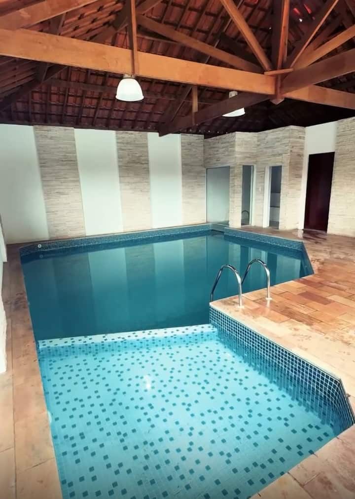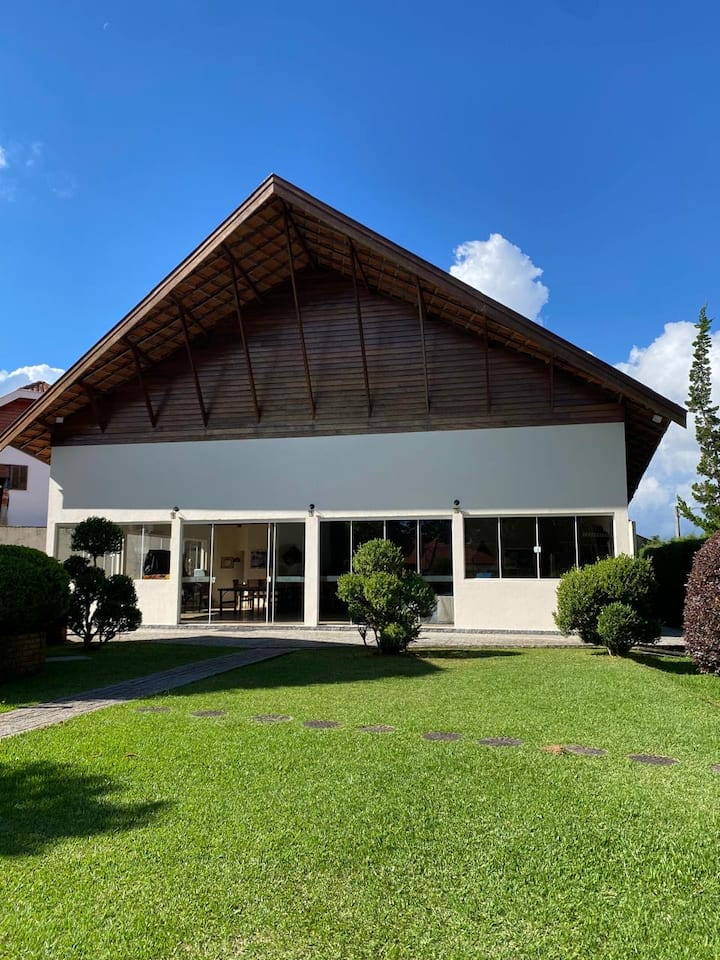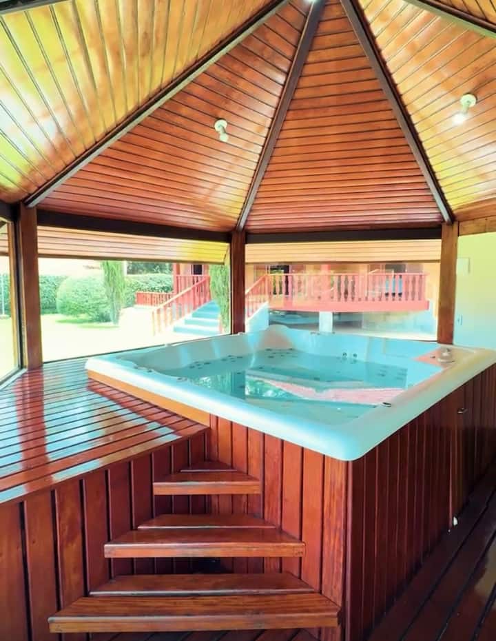 我们有6间套房,位于超过8000平方米的房源内,有许多休闲选择,在6间套房中,2间套房是组合的,是一个美妙的地方,室外区域有12人的大型加热按摩浴缸,多运动场、网球场、有许多选择的游戏室、完整的游乐场、美妙的花园、自然温度的室内游泳池和最完整的美食厨房,在Campos do Jordão有休息室。