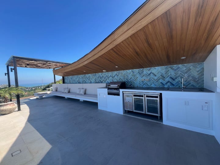 房客可以使用整套公寓,包括宽敞的开放式起居区、设备齐全的厨房、两间套房双人卧室以及带跳水泳池、烧烤、用餐和休息区的独享私人屋顶露台。