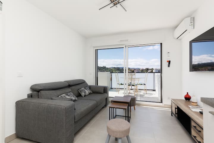 作为直达线路的舒适性,我们的每个房源都由我们的团队精心挑选,确保您拥有难忘的体验。 我们的别墅位于市中心,步行即可抵达Palais des Festivals和海滩,通常位于俯瞰戛纳的高处。